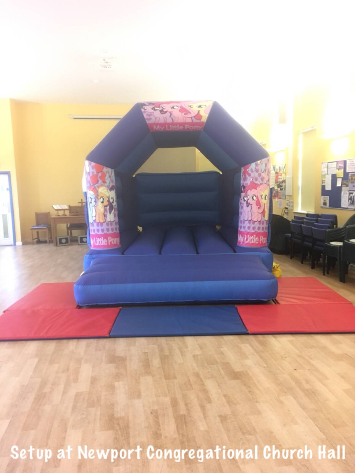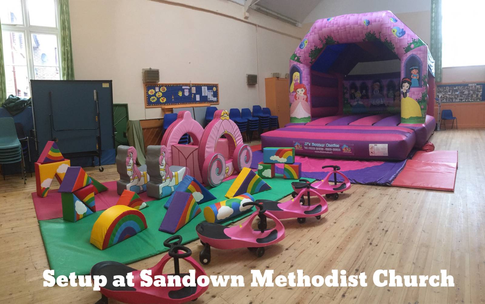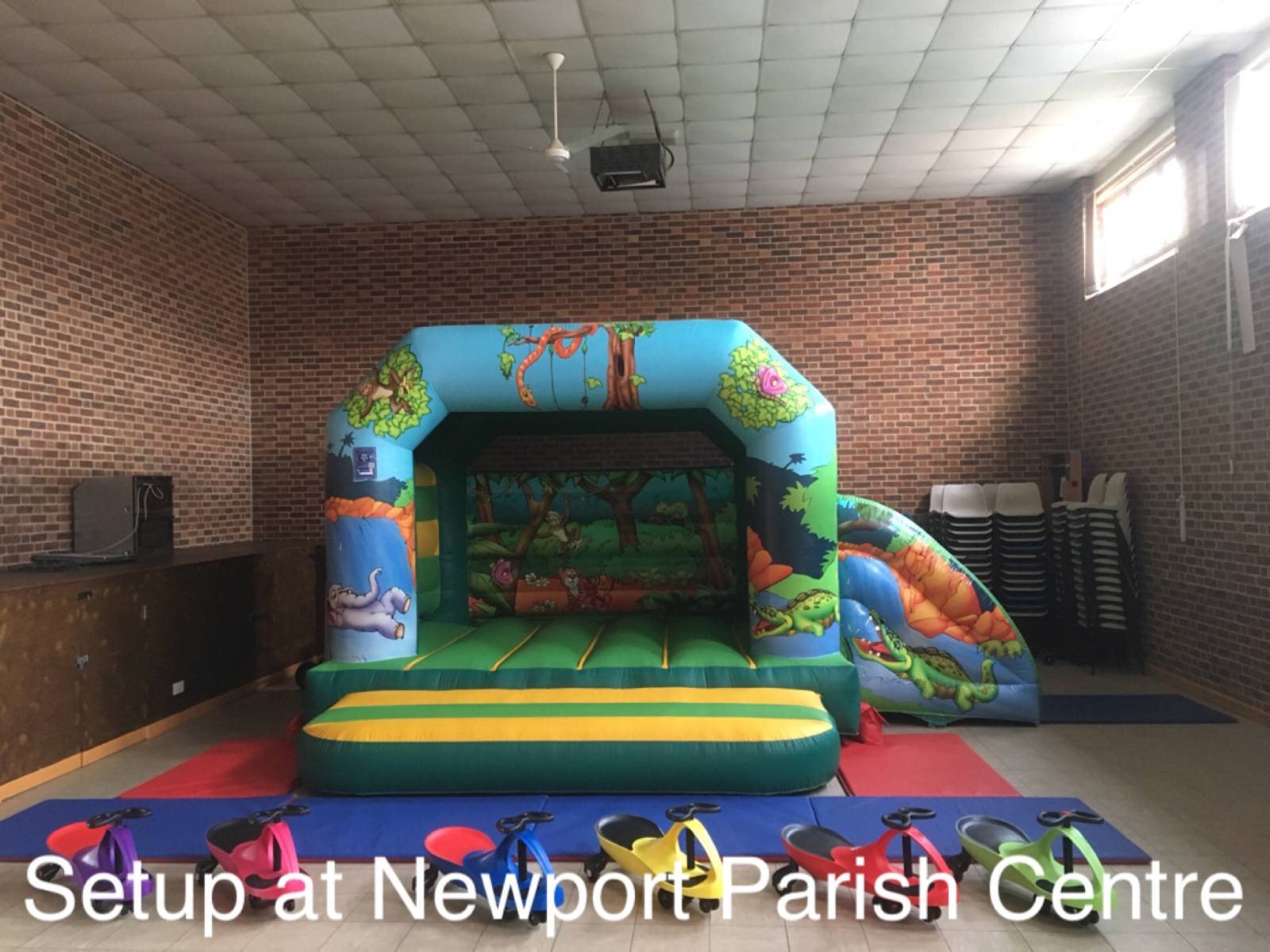This hall will fit our Rainbow toddler bounce and slide. Please note that any bouncy castle setup in this venue will take up 50% of the hall space or more and so is suited to smaller parties only. There is a small kitchen area. No parking is available onsite but there is usually road parking available.