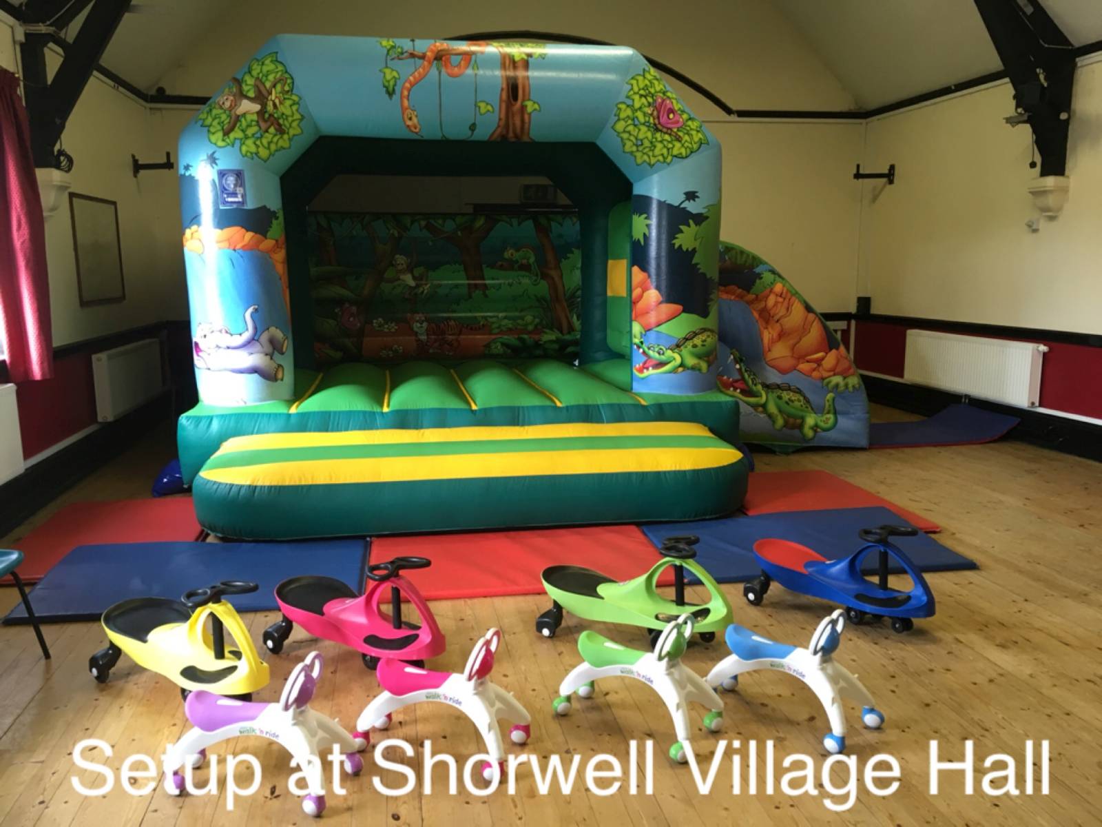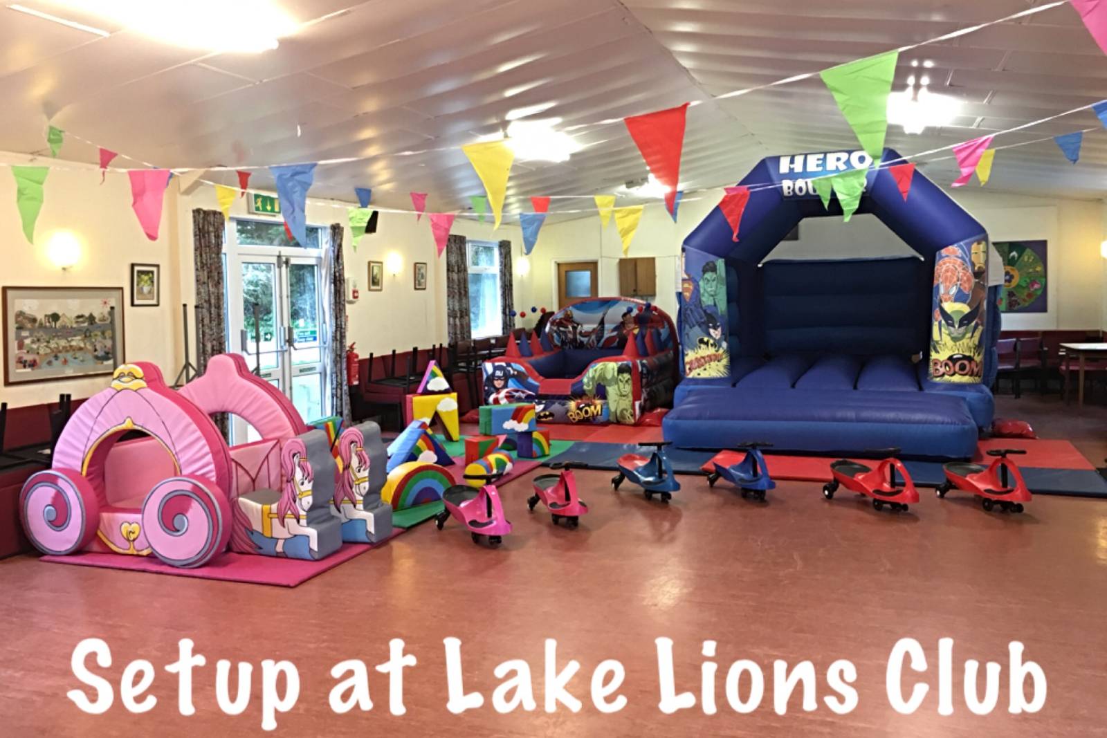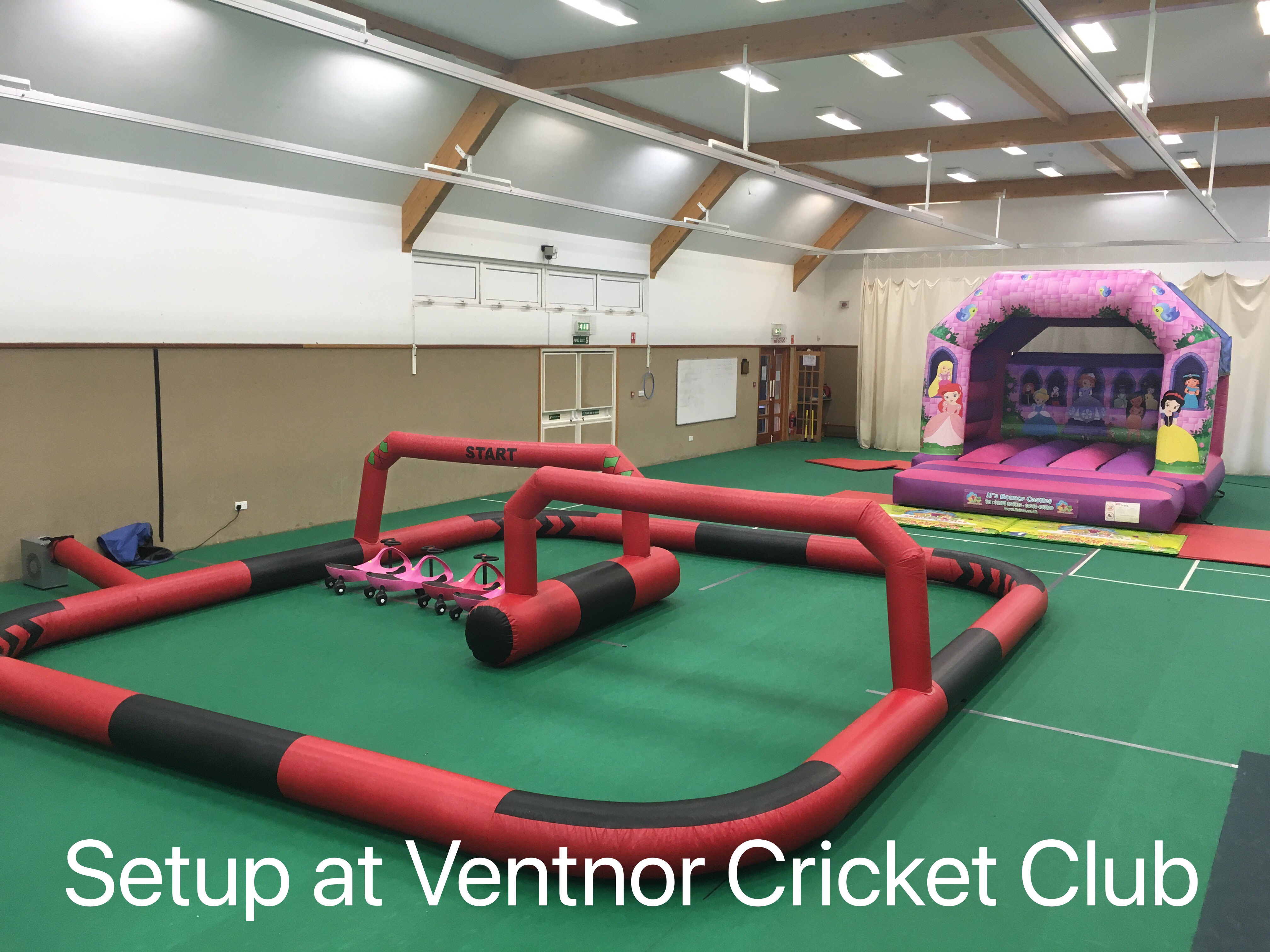 Indoors is only suitable for Soft Play setups due to the halls own restrictions. Ride-ons such as Didi Cars or Walk 'n Ride bikes would not be permitted but it does have a nice sized garden area where bouncy castles can be setup. Everything except our adult castles and Obstacle Assault Course will fit outside.