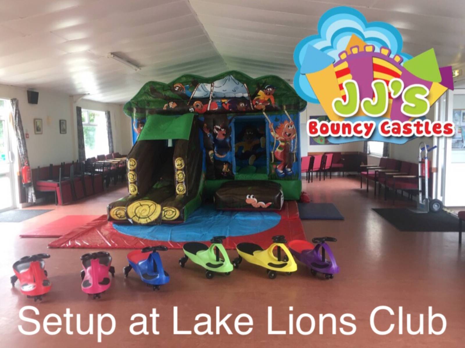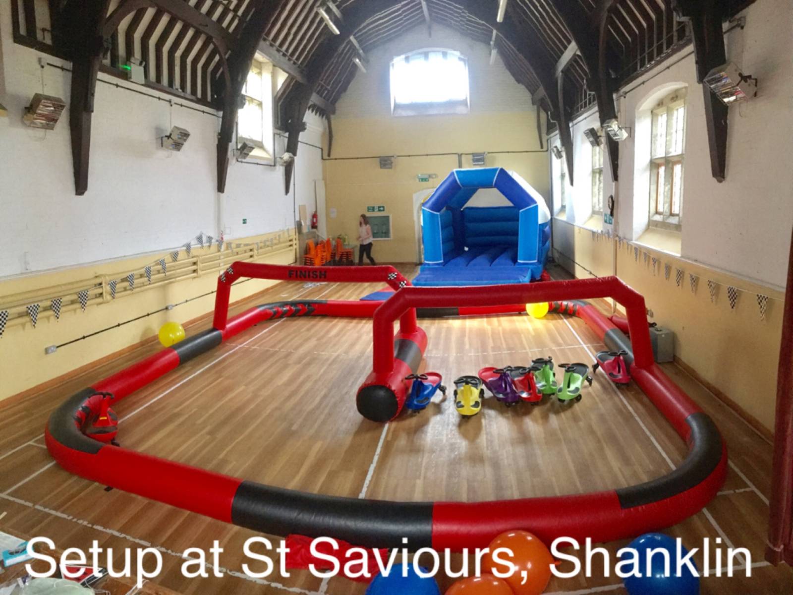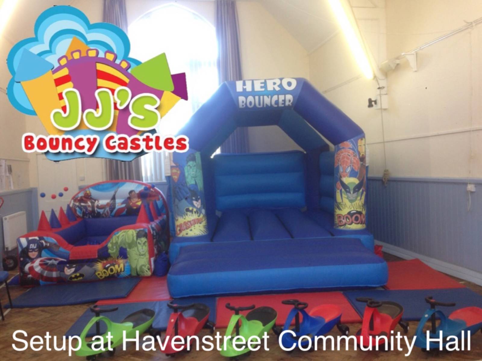 Indoors is only suitable for Soft Play setups due to the halls own restrictions. Ride-ons such as Didi Cars or Walk 'n Ride bikes would not be permitted but it does have a nice sized garden area where bouncy castles can be setup. Everything except our adult castles and Obstacle Assault Course will fit outside.