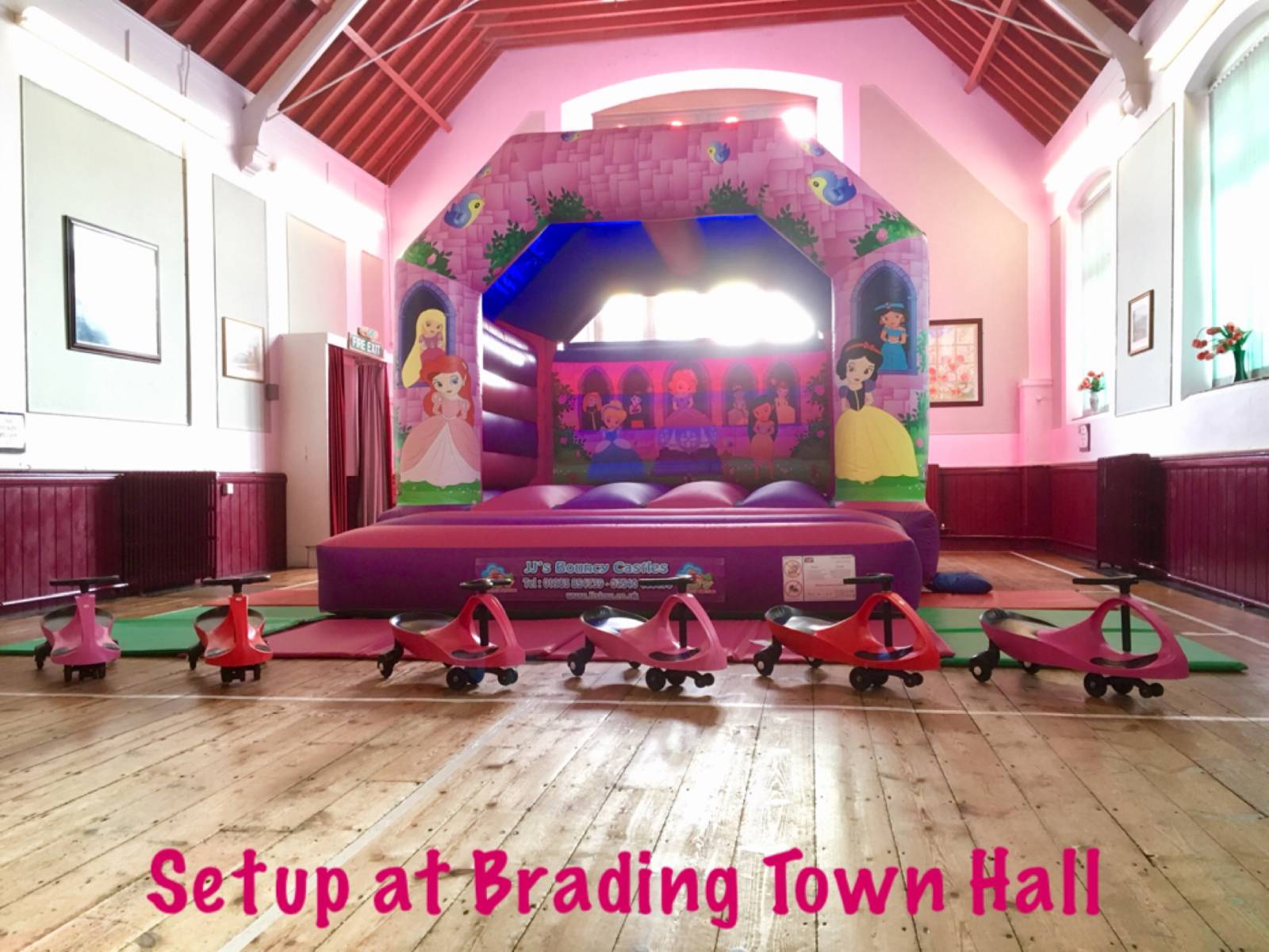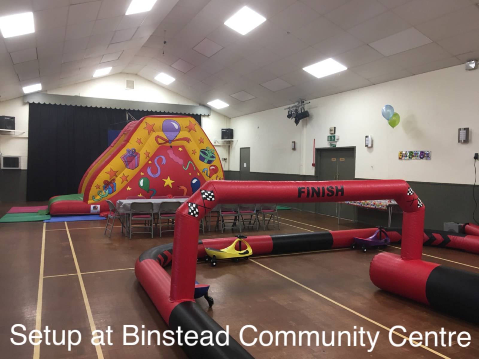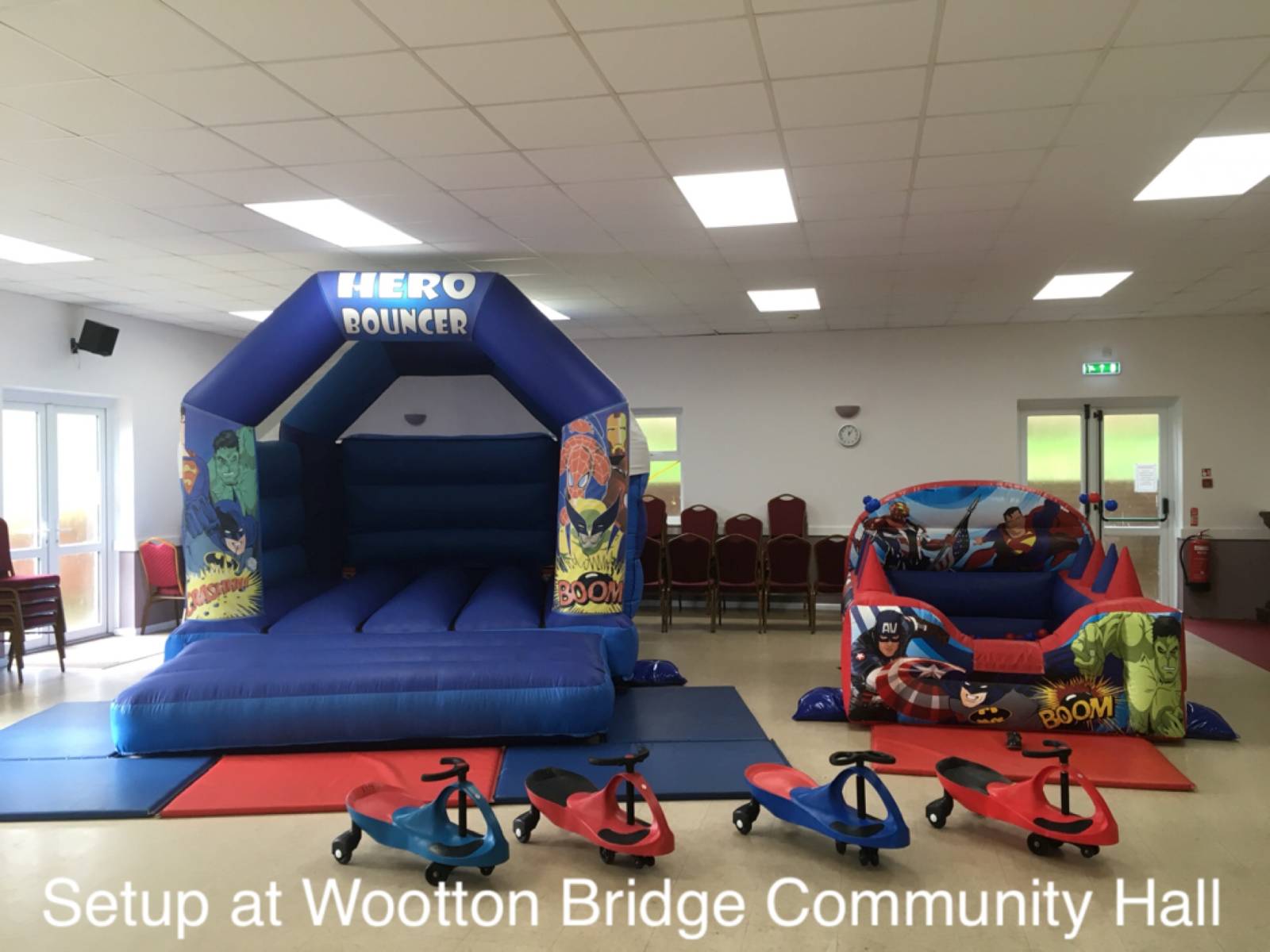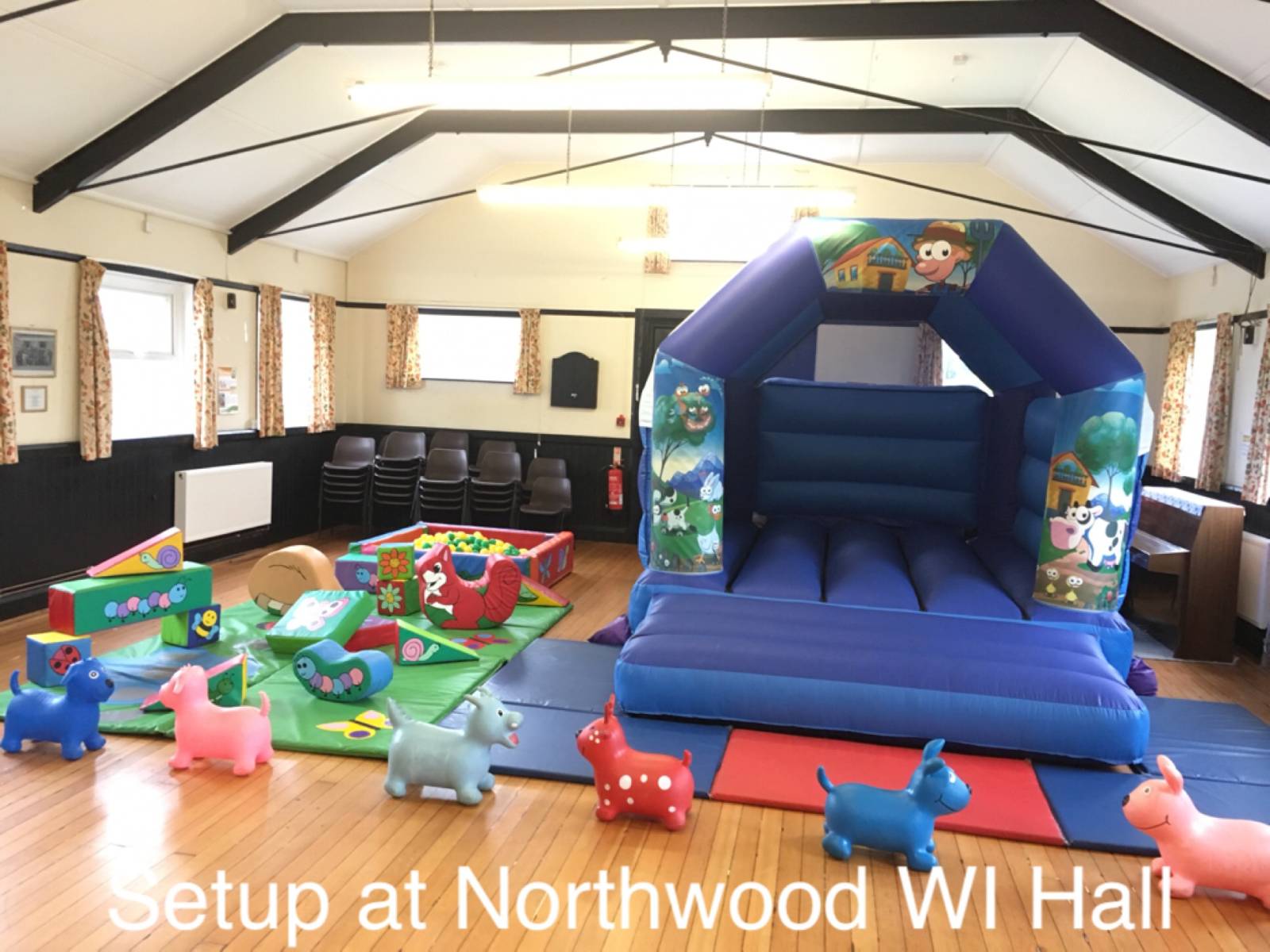 This hall cannot fit any of our bouncy castles due to the low ceiling but can fit soft play and inflatable ball pools. Good access. Suitable for smaller parties.
