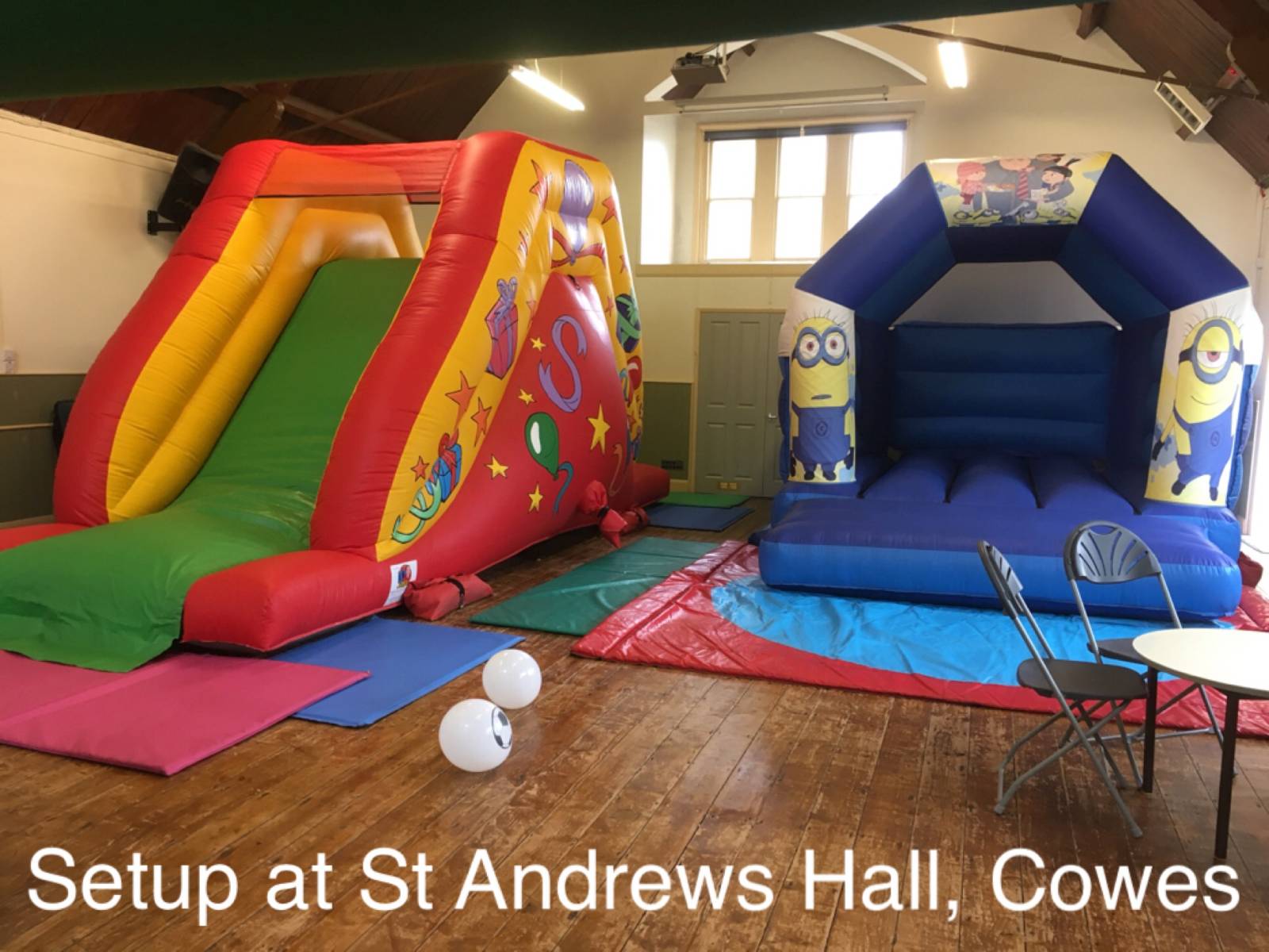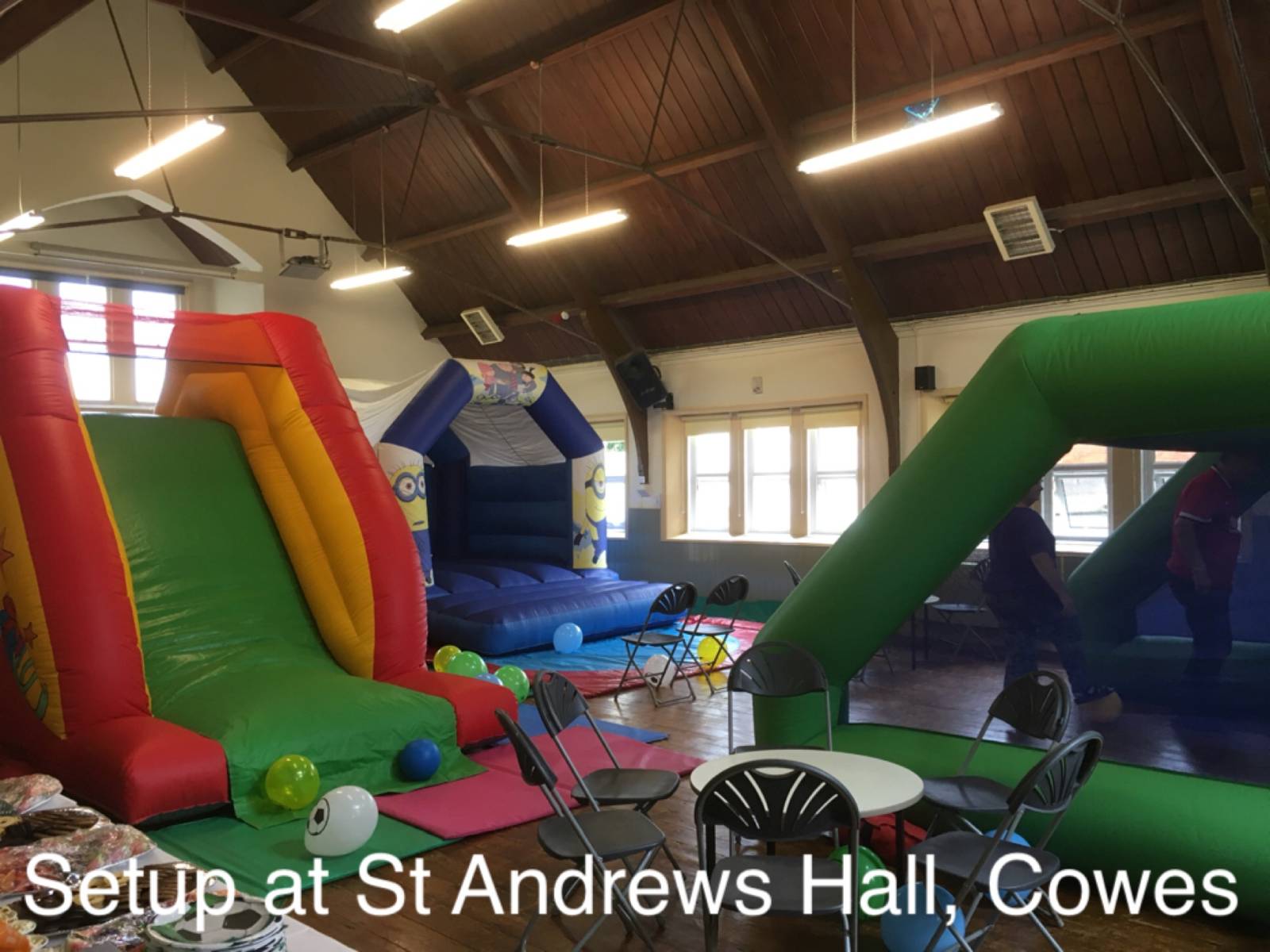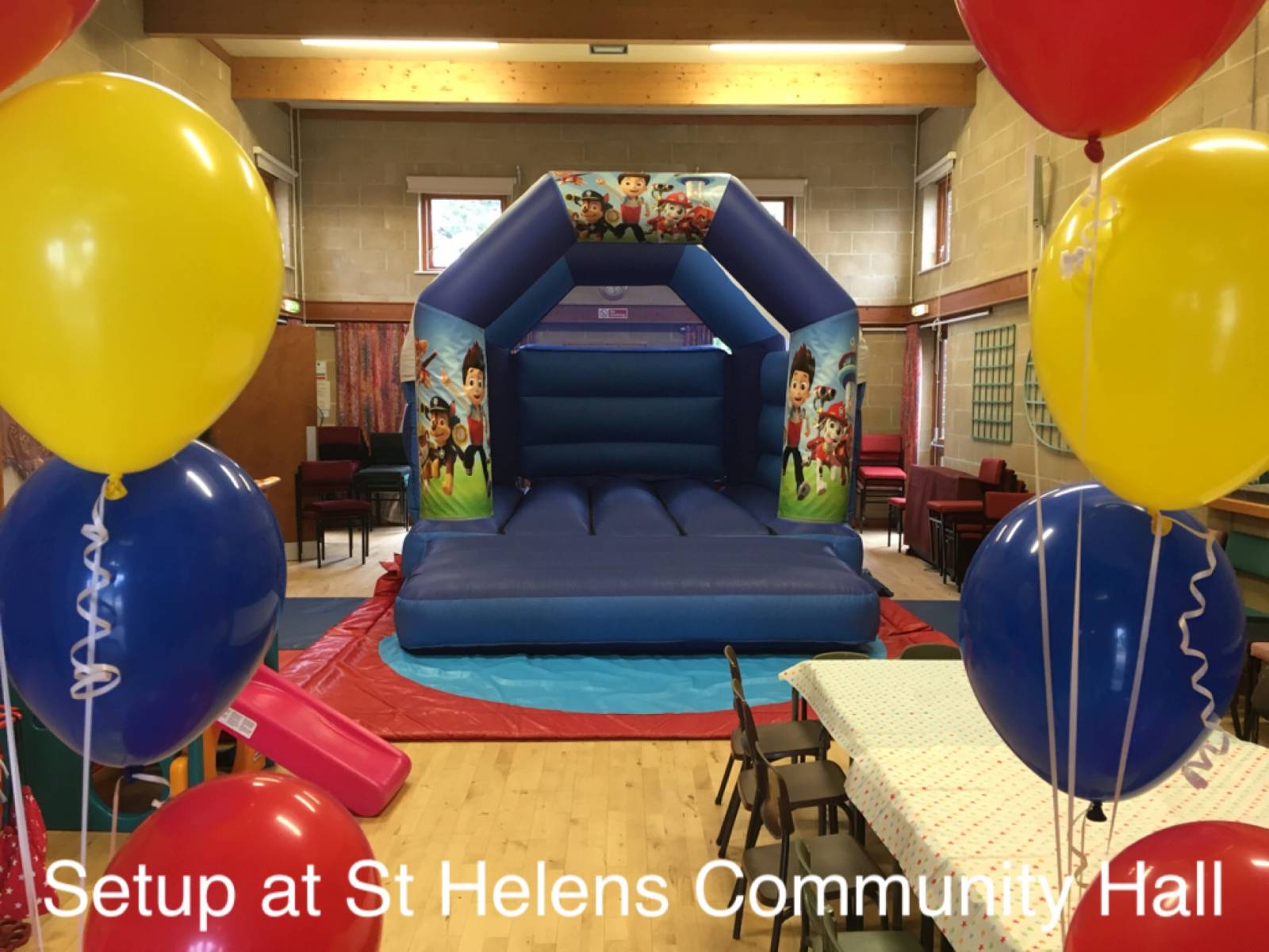 This venue will fit any of our hire items except the obstacle assault course. Only one inflatable at a time would be suitable. Good access. Good kitchen access into the hall area with a hatchway as well. No parking onsite and very limited parking on the road but there is a good sized car park within walking distance. The car park is across a busy road but there are pedestrian crossings.