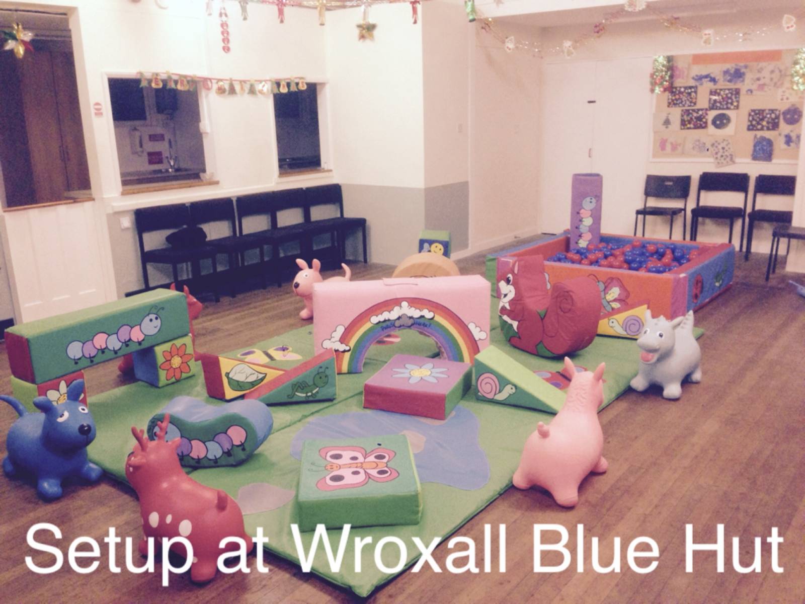 This hall will only fit our smaller Soft Play packages and our ball pools indoors but can fit any of our hire items outdoors. Indoor only parties would need to be for smaller groups. Parking is available.