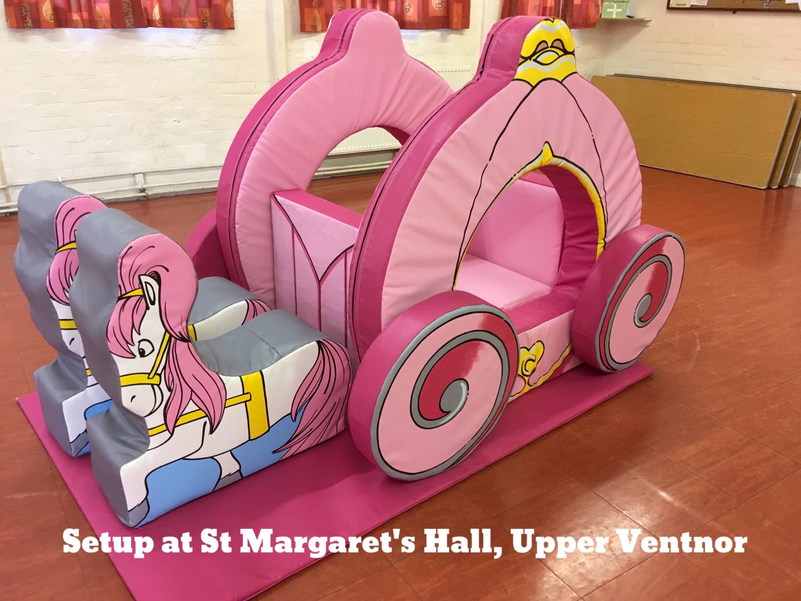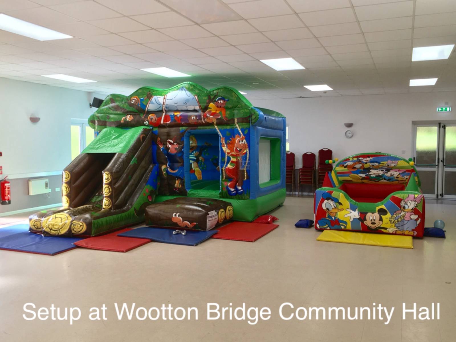 This hall (Upper hall only) will fit our toddler bouncy castle but due to its low ceiling height that’s the only one. However it will fit any of our Soft Play Packages. Good access. It also has a large out door area where any of our hire items can be setup. In addition it benefits from its own off road car park and access ramps to the hall.
