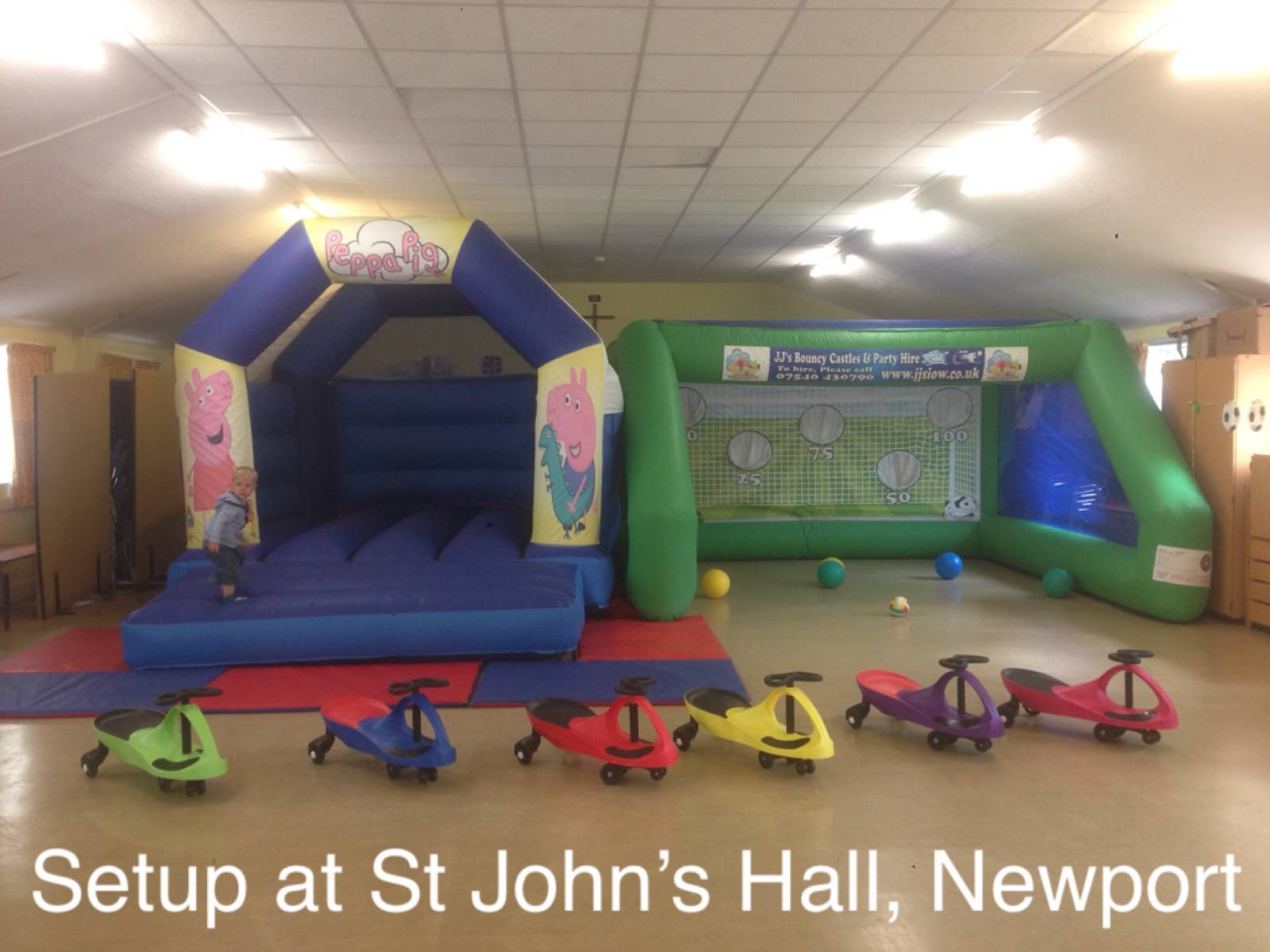 This hall will fit any of our soft play packages, our smaller castles including the slide castles. It will also fit our penalty shootout and Didi car racetrack. Only one inflatable will fit per hall. Road parking only and where available.