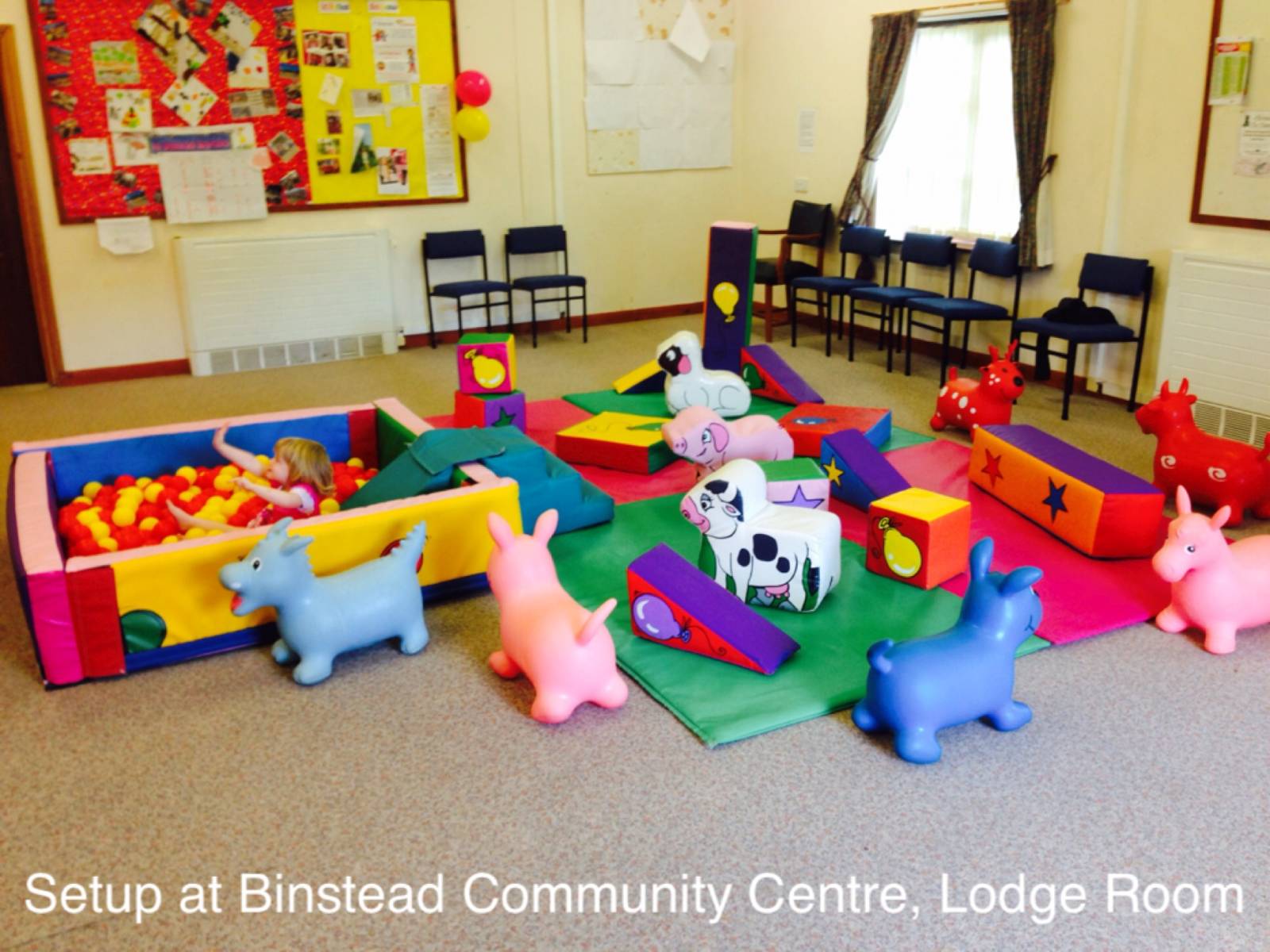 This venue will fit our Rainbow Toddler Bounce and Slide or Farmyard soft play indoors, it also (at a squeeze) fits our Didi Car Racetrack. It has ample outdoor space which will accommodate any of our hire items, it is a very well maintained venue and has loads of parking space on site. The hall sits in the grounds of a cricket pitch and although next to a main road has a good treeline and fencing that keeps children safe within the pitch. Good access.