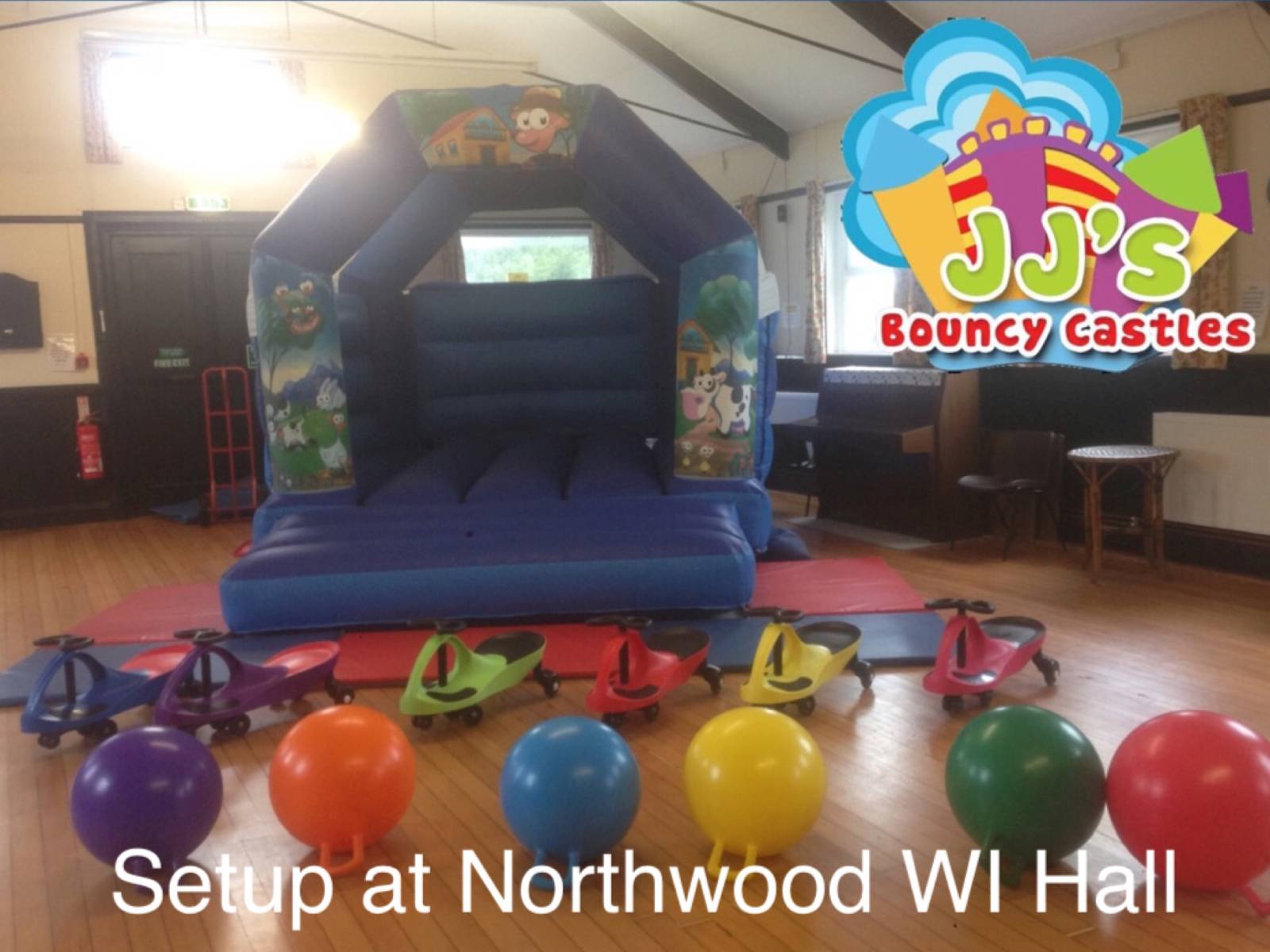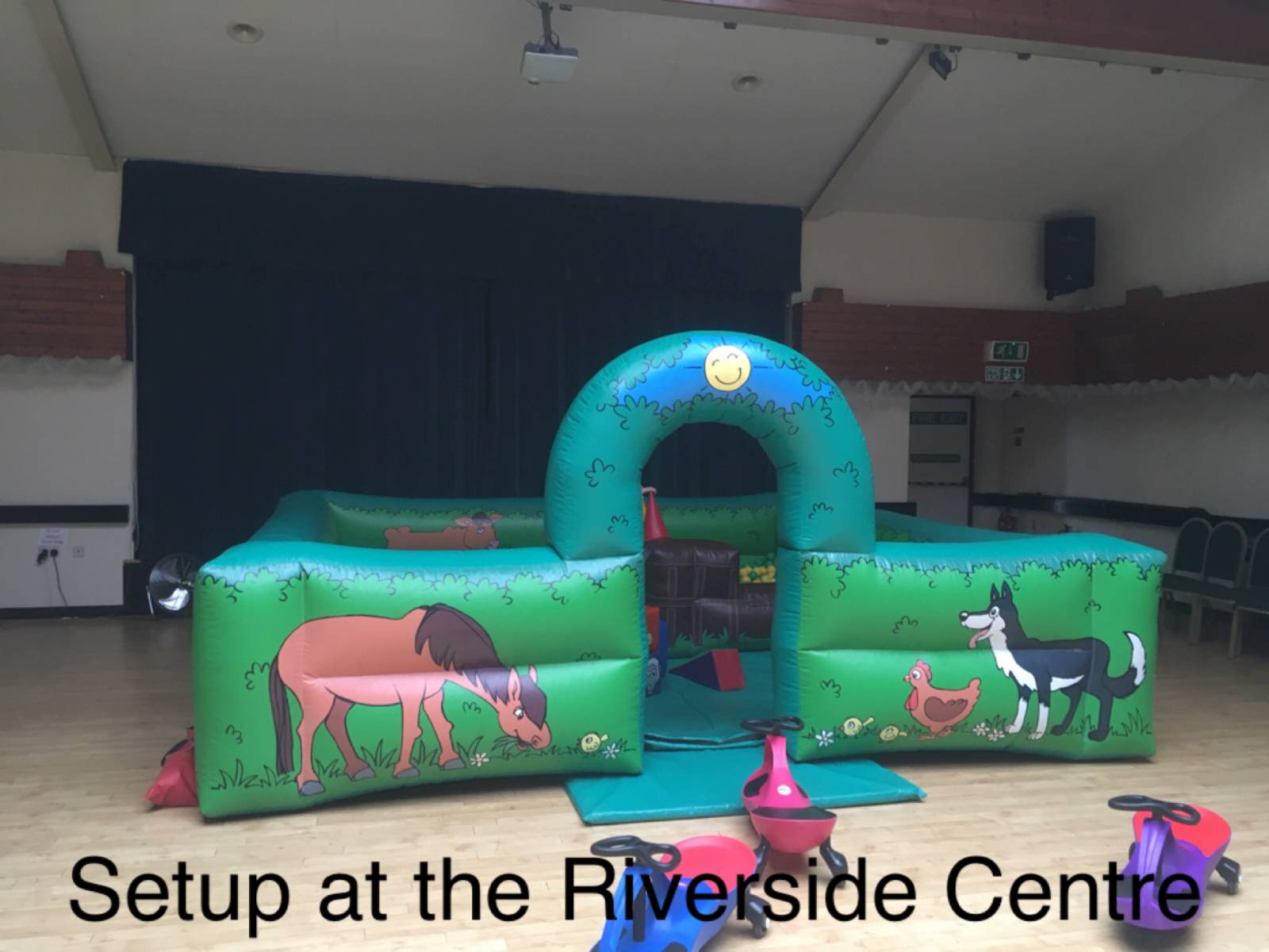 This hall will not fit a bouncy castle but will fit any of our other popular items such as soft play or the Didi car racetrack. Good access. Nice sized kitchen and a large car park attached.