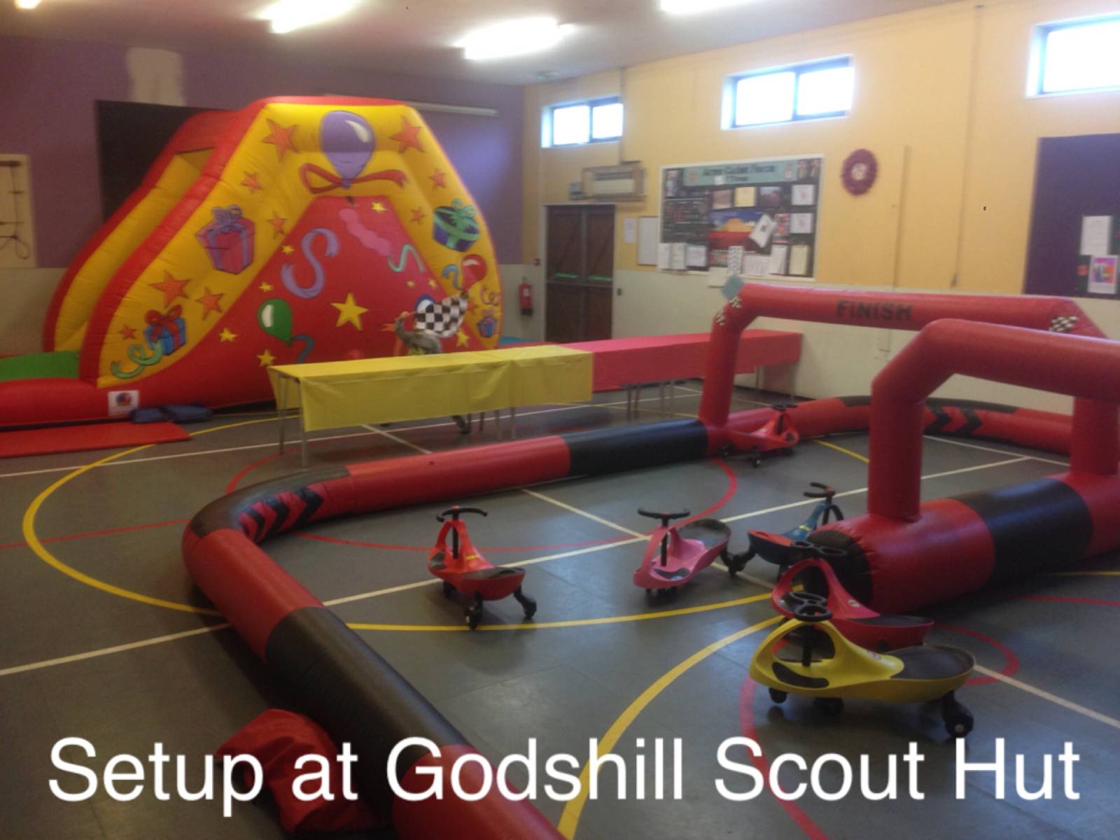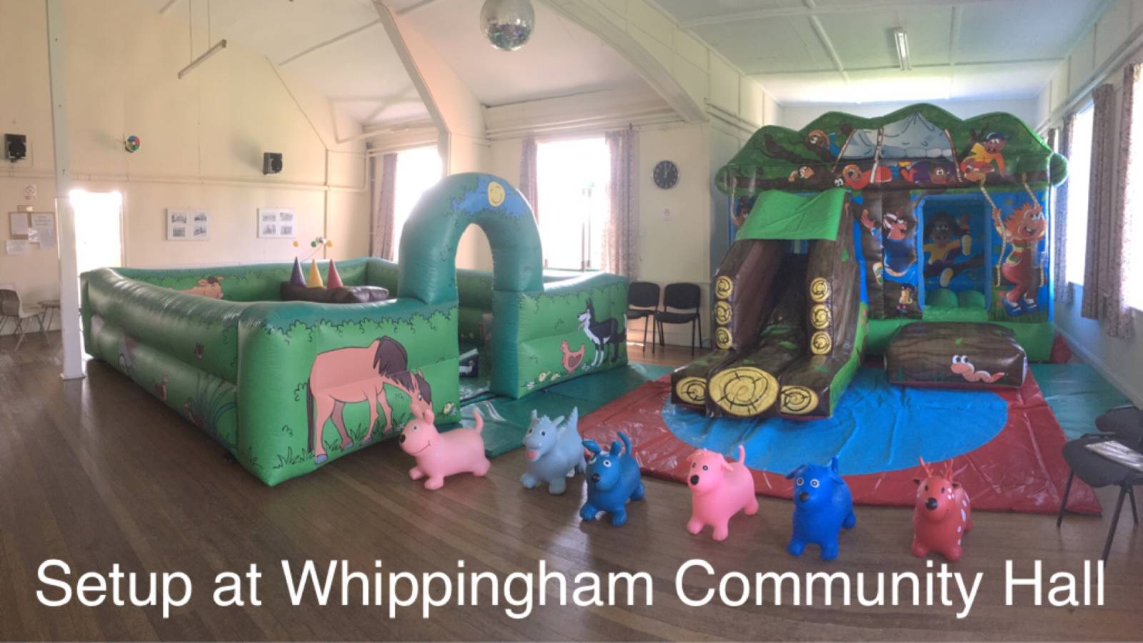 This hall will fit any of our hire items and can fit more than one inflatable. Good access. Good sized kitchen with hatchway access into the main hall, It also benefits from it's own smaller car park.