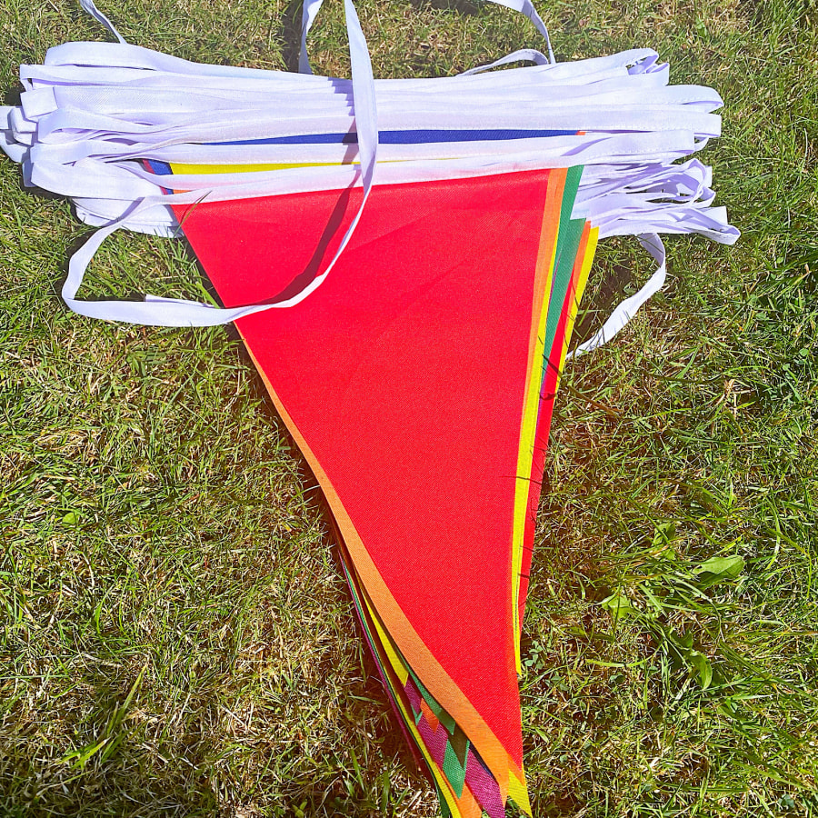Available to hire Island wide across the Isle of Wight. Minimum hire charges apply. Our Bright and colourful Triangular Bunting is made from 100% Polyester and is suitable for indoor and outdoor use. Available in 20m lengths which gives you 54 flags that are 30cm x 20cm.