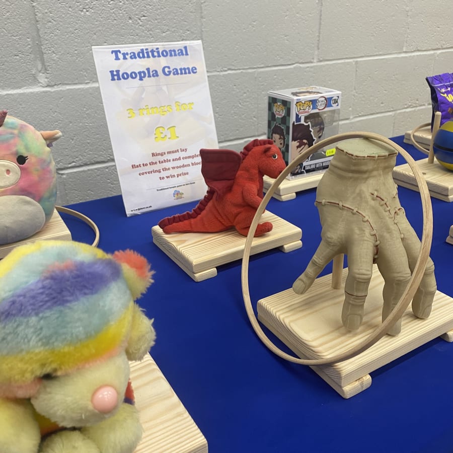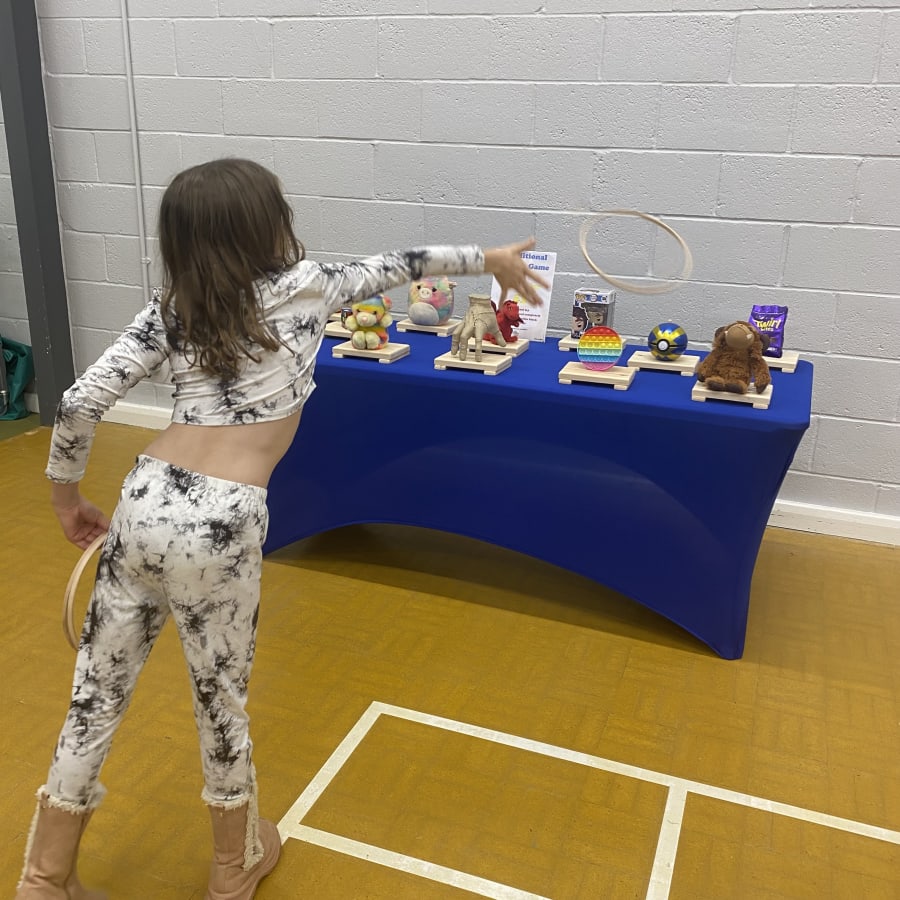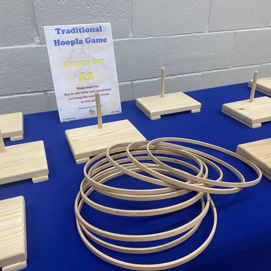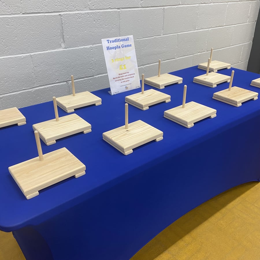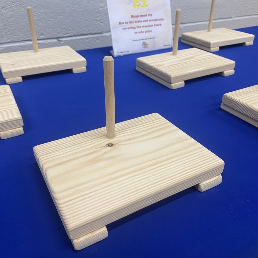Available to hire Island wide across the Isle of Wight. Minimum hire charges apply, this is an add-on item only. This is a great option for school and village Fetes and Fairs. This simple game is great for all ages and tailored for your event as you can add prizes relevant to your theme. Throw the hoops over the wooden blocks so that they cover the block and lay flat to the table. Sound simple? It isn't, but it's highly addictive! Each wooden block comes with a wooden pole to help prop up the prizes. We recommend using elastic bands for items that fall over easily placed around the pole and the prize. Prizes should not exceed base size with any overhang.