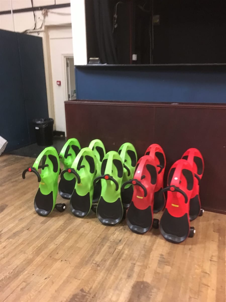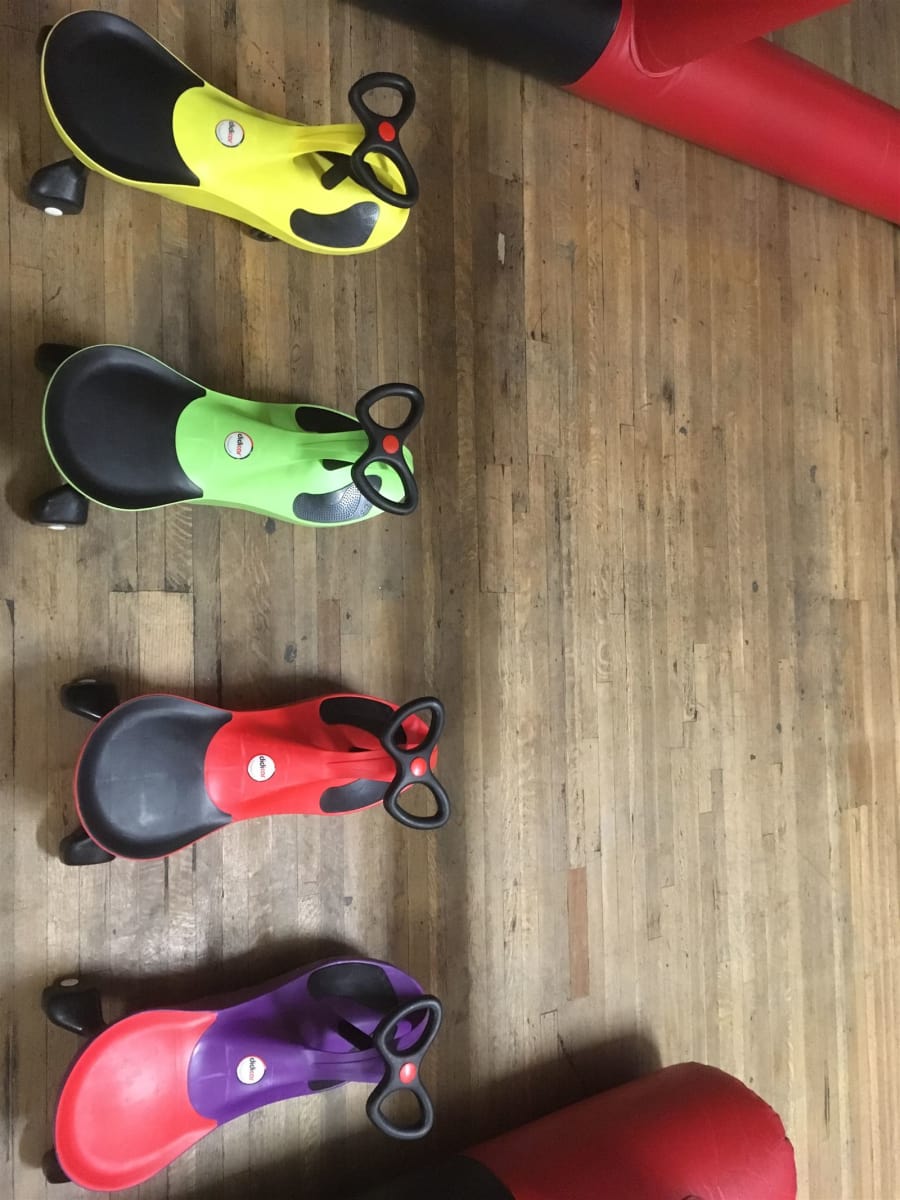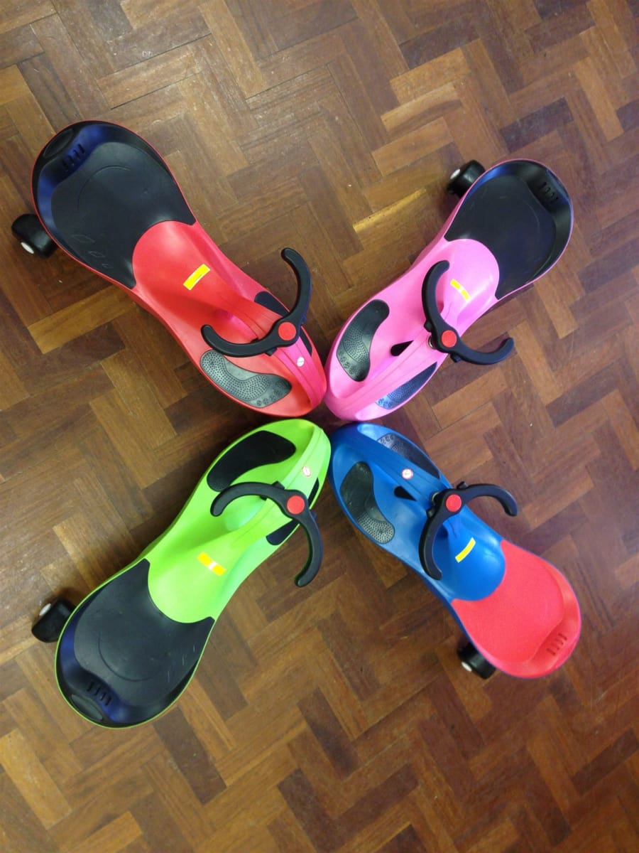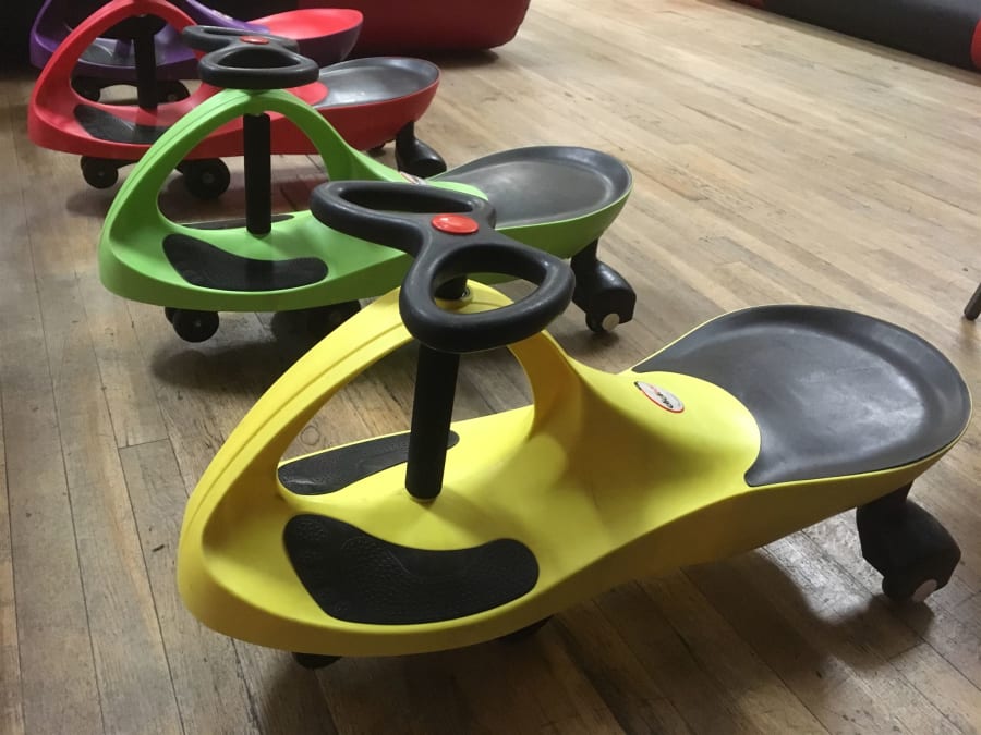 By placing your bum on the seat and your feet on the foot rests at the front so your entire body is off of the floor you can then wiggle the steering wheel, slightly at first, to gain forward momentum. It really doesn't take more than a few seconds to get the hang of them and once you do you'll never want to get off! Once you have momentum you can get around quite quickly and if you flip the steering wheel 180° you can even go backwards too!